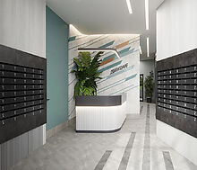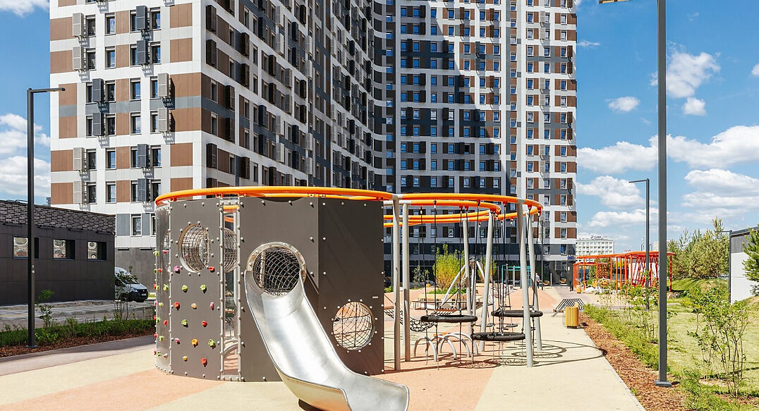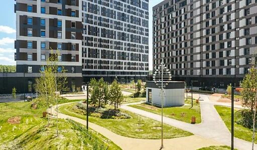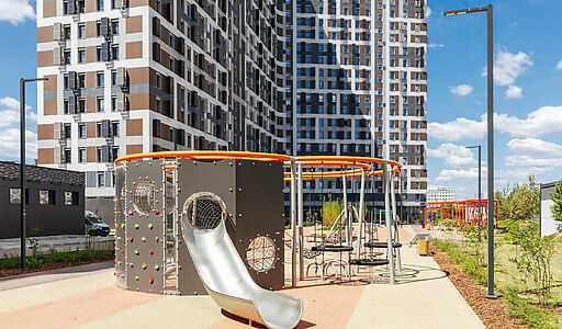 Внутри комплекса работают несколько шумопонижающих лифтов. На первом этаже расположены зоны ожидания, кладовые и колясочные. Огороженная и закрытая для посторонних придомовая территория с озеленением предлагает пешеходные дорожки, зоны отдыха и детские площадки.