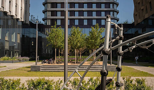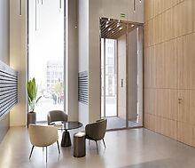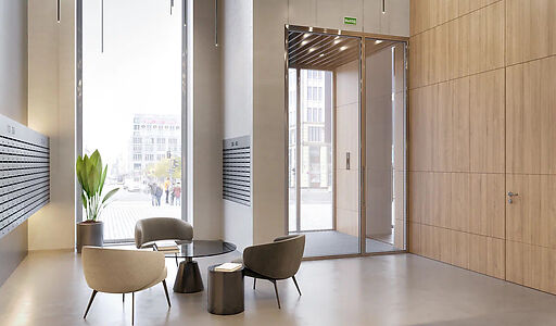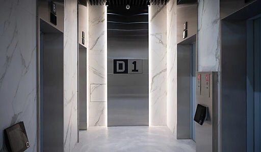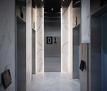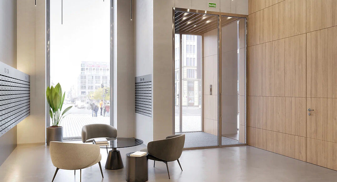 В лобби каждого корпуса есть ресепшн, лаундж-зоны, колясочные комнаты, санузел на первом этаже, мойка для лап собак. Высота потолков — больше 5 метров. В комплексе установлены бесшумные лифты KONE, которые не придётся ждать более 50 секунд.