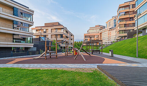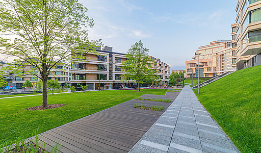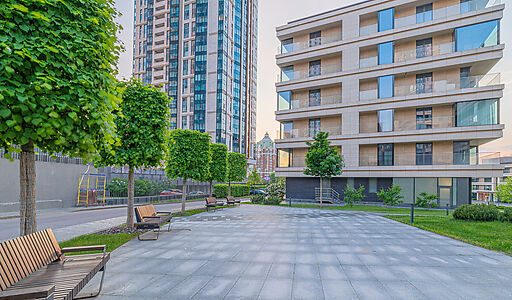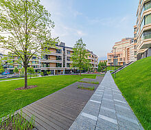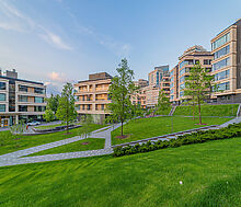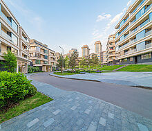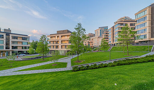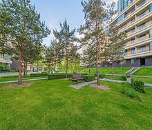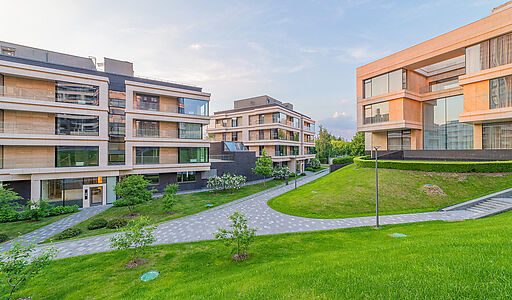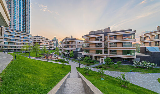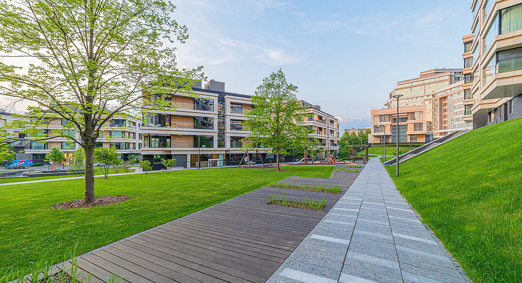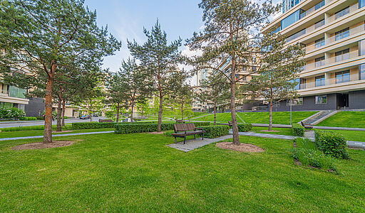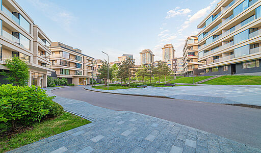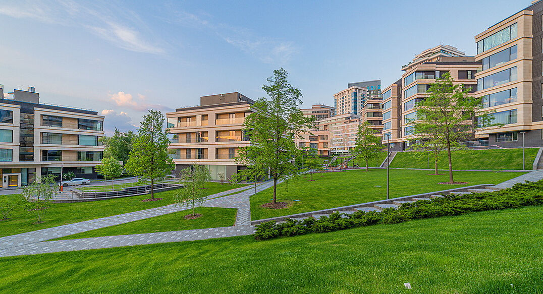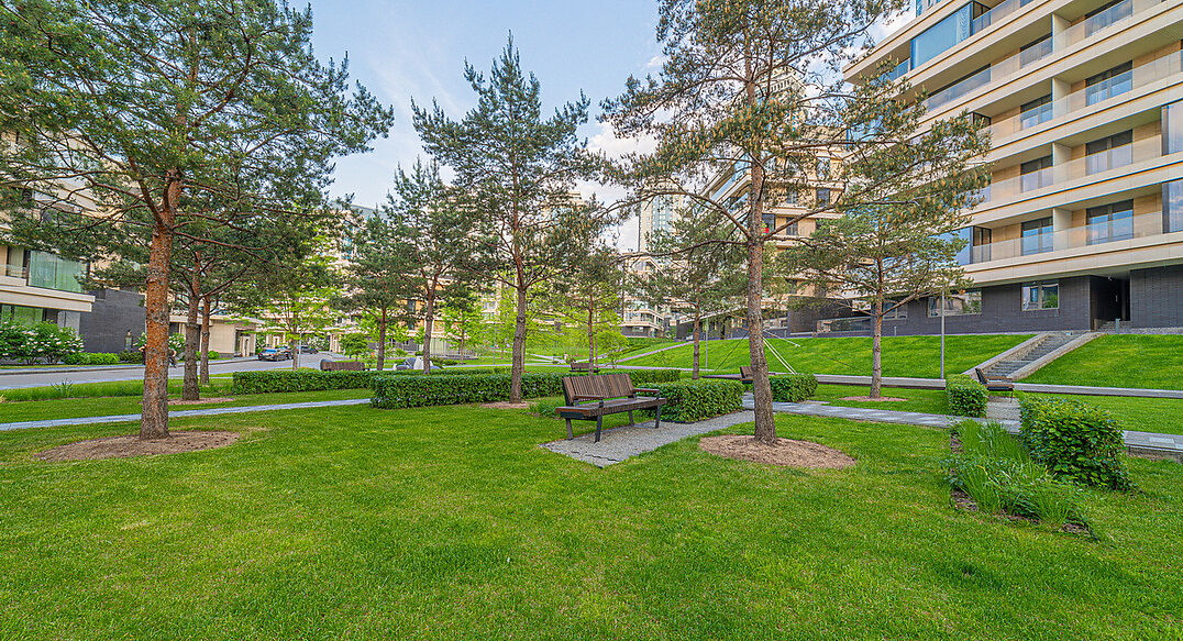 На территории жилого комплекса расположен собственный парк с размашистой сетью удобных тропинок. Благоустройство разработано с учетом интересов всех групп жителей, в том числе людей с ограниченными возможностями. Парк насыщен многолетними зелеными насаждениями, на территории будет расти более 200 деревьев.