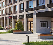 Жилые корпуса сформируют закрытое от машин внутреннее охраняемое пространство с удобным зонированием и разнообразием малых архитектурных форм. На территории предусмотрен: -Собственный яблоневый сад, -Закрытая территория, -Большой приватный двор, -Собственный двухуровневый подземный паркинг на 1200 машино-мест, -Детские площадки 900 м -Школа на 400 мест -Детский сад на 260 мест -На первых этажах зданий разместятся кафе, магазины, аптеки, салоны красоты.